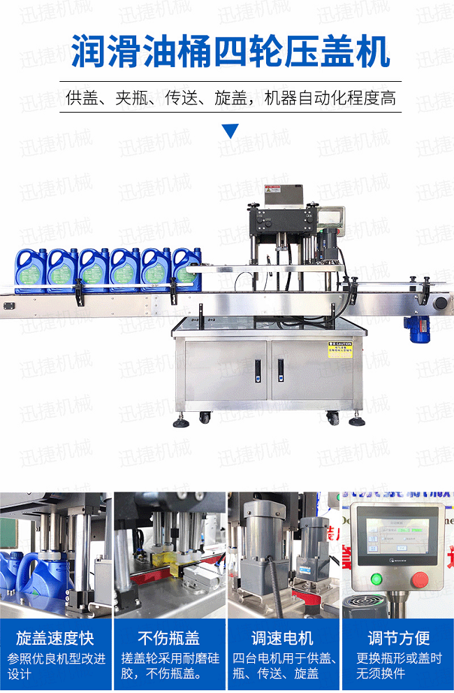 全自動旋蓋機是參照國機型改進設計、旋蓋速度快,合格率高、操作方便。可適用于食品、制藥、日化、農藥、化妝品等行業(yè)的不同瓶形的旋蓋。四臺調速電機分別用于供蓋、夾瓶、傳送、旋蓋,機器自動化程度高,穩(wěn)定性好,調節(jié)方便,更換瓶形或蓋時無須備件,只需作調整即可完成(如配上蓋機,可進行自動上蓋)可以根據實際需要選配。