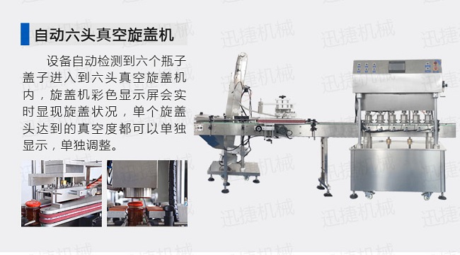 自動供瓶機+全自動滾筒洗瓶機+自動六米烘干機+自動收瓶機+全自動六頭灌裝機自動灌裝+全自動提蓋機自動理蓋、提蓋、掛蓋+六頭真空旋蓋機同時六個頭真空旋蓋+套標(biāo)機+收縮機+圓瓶貼標(biāo)機+整理平臺;
