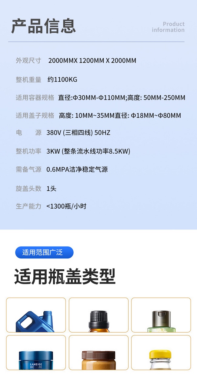 跟蹤式旋蓋機(jī)是在聯(lián)機(jī)取放旋蓋機(jī)的基礎(chǔ)上設(shè)計(jì)的,它解決了聯(lián)機(jī)拾放旋蓋機(jī)容量低的問(wèn)題,其運(yùn)動(dòng)由運(yùn)動(dòng)控制器控制,比PLC更、更準(zhǔn)確,封蓋時(shí),封蓋頭隨著瓶子的移動(dòng)而移動(dòng)。它可以配備一個(gè)或兩個(gè)封蓋頭,容量從 40B/M 到70B/M 無(wú)需考慮瓶子和蓋子的大小(基于 100ML到5000ML瓶子)。