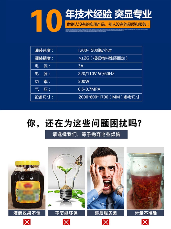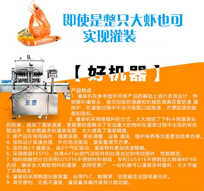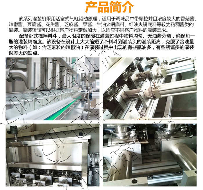 該系列灌裝機(jī)采用活塞式氣缸氣動(dòng)原理,適用于調(diào)味品中帶顆粒并且濃度較大的香菇醬、辣椒醬、豆瓣醬、花生醬、芝麻醬、果醬、牛油火鍋底料、紅油火鍋底料等較為粘稠醬類的灌裝。灌裝轉(zhuǎn)閥可以很具客戶物料定做加大,以適應(yīng)不同客戶物料的灌裝需求。配備臥式攪拌料斗,限度的保障在灌裝過程中物料均勻、無油醬分離,確保每一瓶的灌裝精確度,該設(shè)備在設(shè)計(jì)上大大縮短了下料斗到灌裝頭的灌裝距離,克服了含油量大的油料(如:含芝麻粒的辣椒油)在灌裝過程出現(xiàn)的有些瓶油多,有些瓶醬多的灌裝誤差大的缺點(diǎn)。