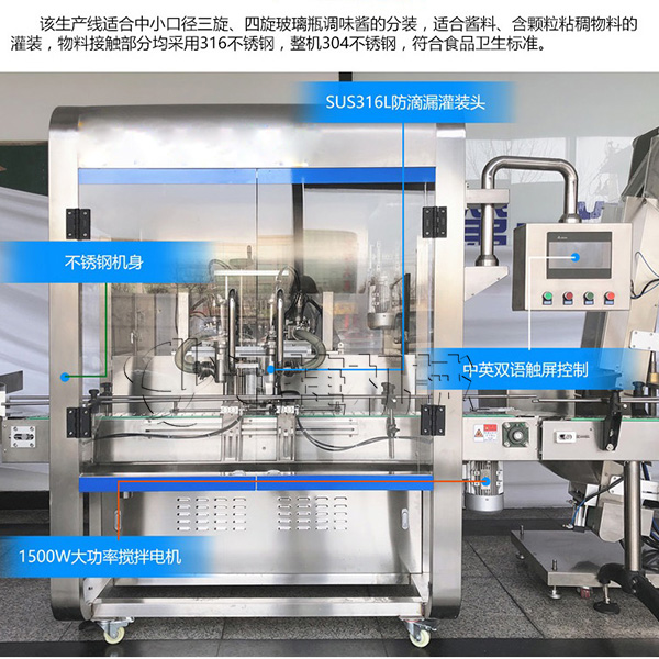 該機為雙頭辣醬灌裝機,配有自動攪拌功能,使物料混合更加均勻 ,有效的解決灌裝誤差大的問題;雙頭辣醬灌裝機輔料添加料可調,精準方便,提高自動化程度。 雙頭辣醬灌裝機氣動部分均采用知名氣動元件,壽命長,穩定。 物料接觸部分采用SUS316L不銹鋼材料制成,符合食品醫藥安全衛生要求。 灌裝閥由氣動閥控制,灌裝精度更高。 這款雙頭辣醬灌裝機幫您解決醬會堵塞的問題
