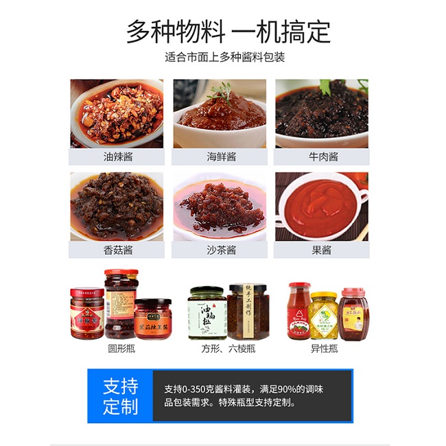 牛肉醬灌裝機采用活塞式氣缸氣動原理,適用于調(diào)味品中帶顆粒并且濃度較大的香菇醬、辣椒醬、豆瓣醬、花生醬、芝麻醬、果醬、牛油火鍋底料、紅油火鍋底料等較為粘稠醬類的灌裝。灌裝轉(zhuǎn)閥可以很具客戶物料定做加大,以適應不同客戶物料的灌裝需求。